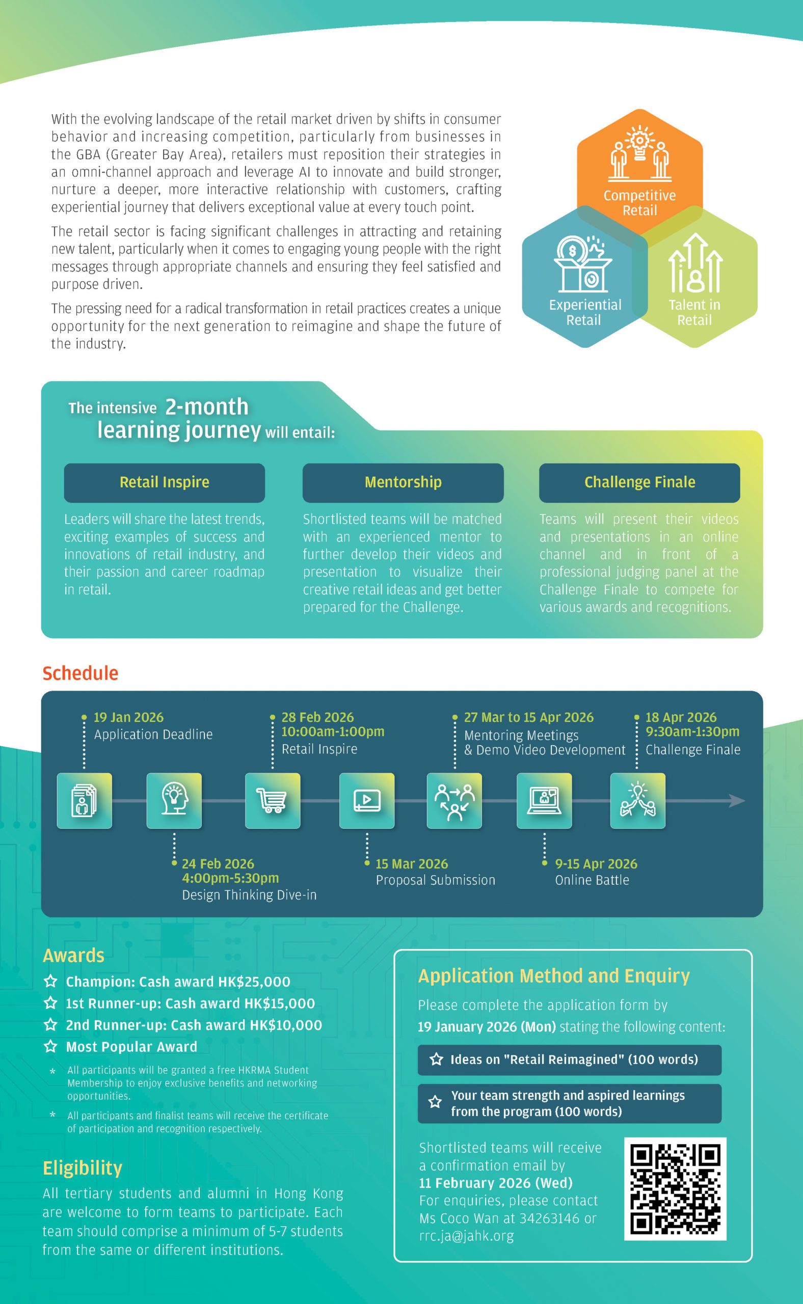 Tertiary students from ALL disciplines are cordially invited to join the “Retail Reimagined” Challenge 2026 organized by the Hong Kong Retail Management Association (HKRMA) in partnership with leading brands in the industry. Through Leader Sharing and mentorship of experienced industry professionals, you will be empowered to discover the latest & upcoming trends in New Retail, unleash your creativity to redefine retail landscape & the future, and stretch yourselves at a hackathon to win cash prizes and networking opportunities. Sign up NOW!
