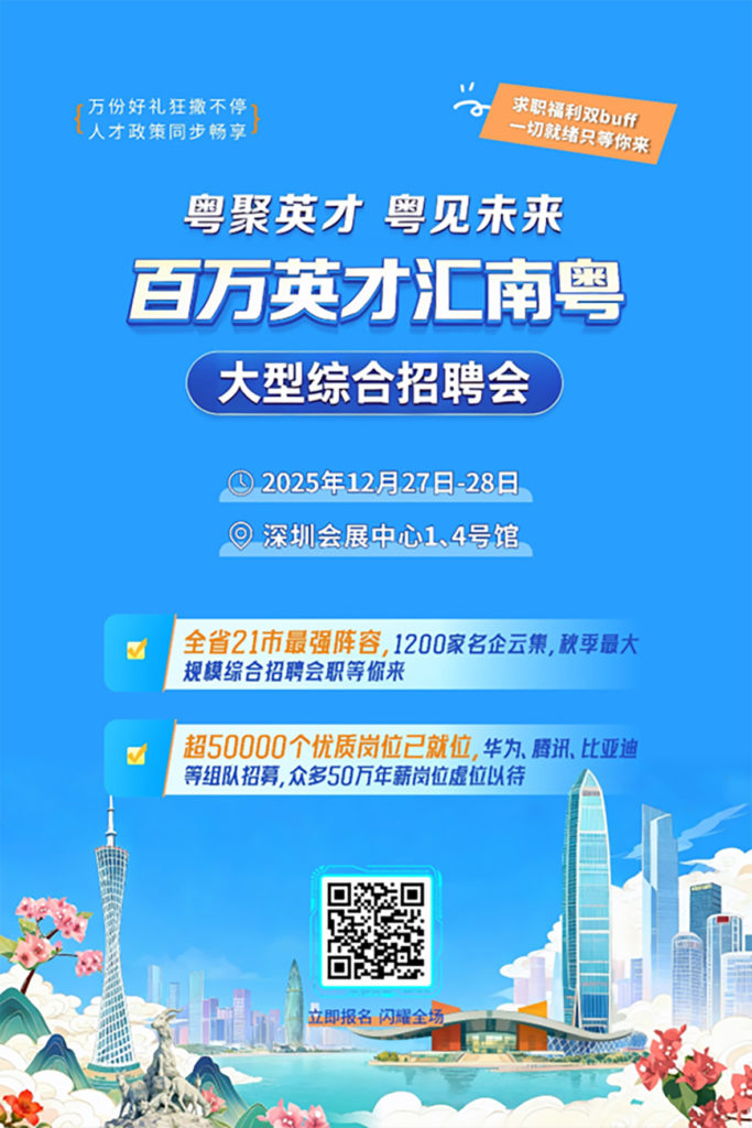 粵聚英才 粵見未來 — ‘百萬英才匯南粵' 2025 年 12 月 27 日— 28 日在深圳會展中心開展 「粵聚英才 粵見未來—‘百萬英才匯南粵’」大型綜合招聘會,全省21市最強陣容1200+家名企雲集,特別邀請華為、騰訊、比亞迪等組隊招募,眾多50萬年薪崗位虛位以待。 招聘活動亮點:• 全省 21 市1200家名企雲集(包括華為 / 騰訊 / 比亞迪等大廠!)• 50000 + 優質崗位,眾多50 萬年薪崗位虛位以待更多企業及崗位詳情:按此了解備註: 主辦方於報名表內,需要報名者填上部份 個人資料,如有疑問,請致電深圳市公共就業服務中心查詢,聯絡電話:19126548356。 You Might Also Like 大灣區青年就業計劃招聘會職業講座錄影片段 May 2, 2024 大灣區青年就業計劃 September 1, 2025 大灣區就業諮詢服務 December 8, 2021