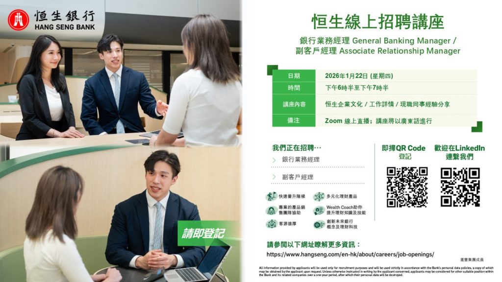 Hang Seng Bank is hosting a Virtual Recruitment Talk for General Banking Manager (GBO) and Associate Relationship Manager (ARM), and we would like to share this exciting event to you.