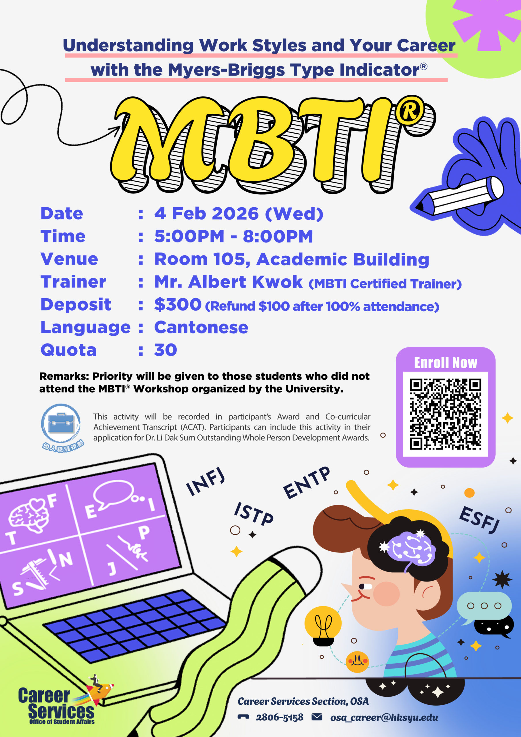 MBTI® is a professional self-evaluating tool for yourself to have a better understanding of your personalities and underlying job preferences. The workshop includes debriefing and experiential activities which will help you understand your own strengths and weaknesses better, and to assist your career selection. Come join our Understanding Work Styles and Your Career with the Myers-Briggs Type Indicator® (MBTI®) workshop if you would like to have a better understanding of yourself, details are as follows: