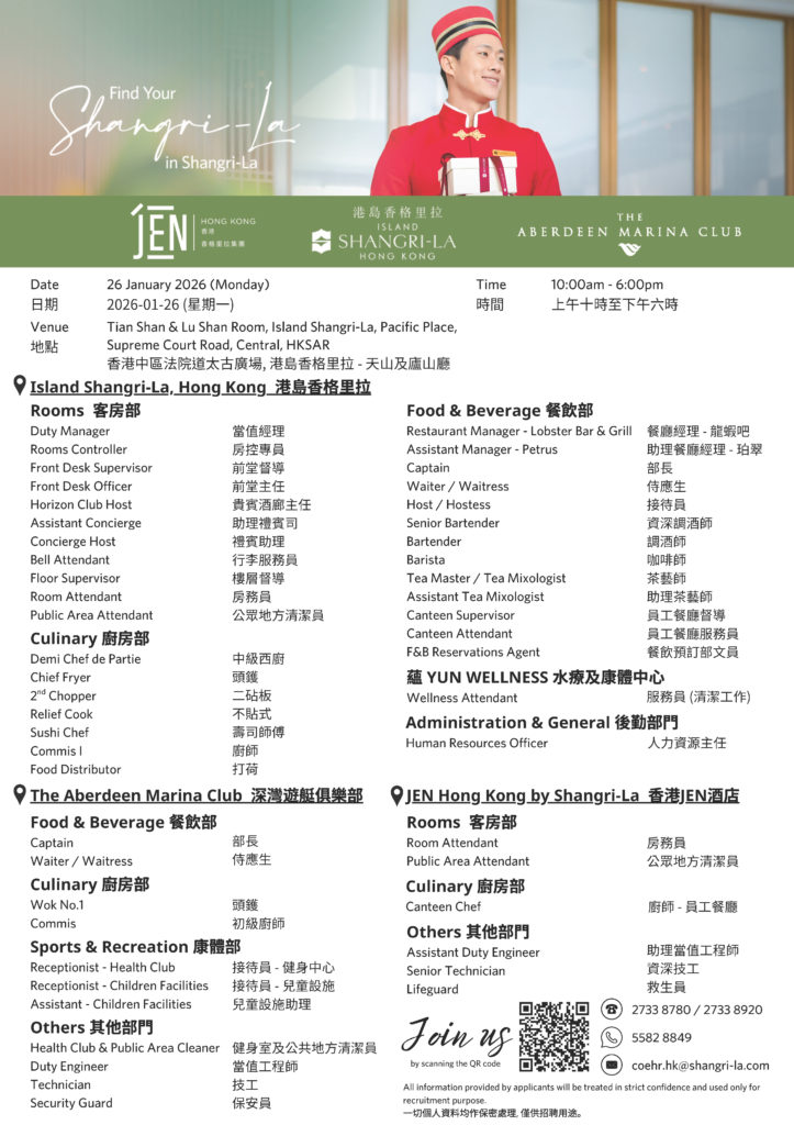 Recruitment Day for Island Shangri-La, Hong Kong, JEN Hong Kong by Shangri-La and The Aberdeen Marina Club will be held on 26 January 2026, Monday: