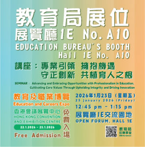 The Education and Careers Expo 2026 (Expo)will be held at the Hong Kong Convention and Exhibition Centre from 22 to 25 January 2026. Education Bureau (EDB)’s booth is at Hall 1E (Booth 1E-A10), introducing to students and jobseekers our various professional grades, including Education Officer (Secondary School Teacher), Primary School Master/Mistress, Inspector (Graduate), Education Officer (Administration), Specialist (Education Services) and Speech Therapist. You will know more about the work and duties, career development and advancement opportunities, fringe benefits, etc. of these grades if you would like to pursue a career in the education profession. Our professional staff will be there to share their work experience and insights.