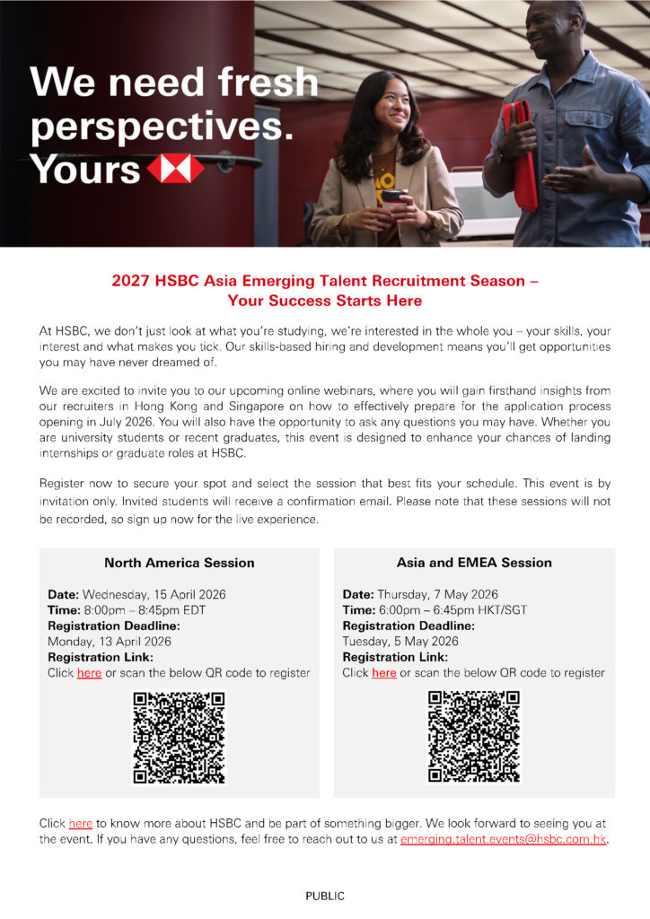 2027 HSBC Asia Emerging Talent Recruitment Season – Your Success Starts Here (Asia and EMEA Session) Date:Thursday, 7 May 2026Time:6:00 pm – 6:45 pm HKT/SGTFormat:Virtual via ZoomRegistration Deadline:Tuesday, May 5, 2026 Register Now You Might Also Like 職涯建未來 Project Careerpillar 2025-27 December 17, 2025 職場新視野招聘會 February 26, 2026 Side by Side – Key to Success August 13, 2024