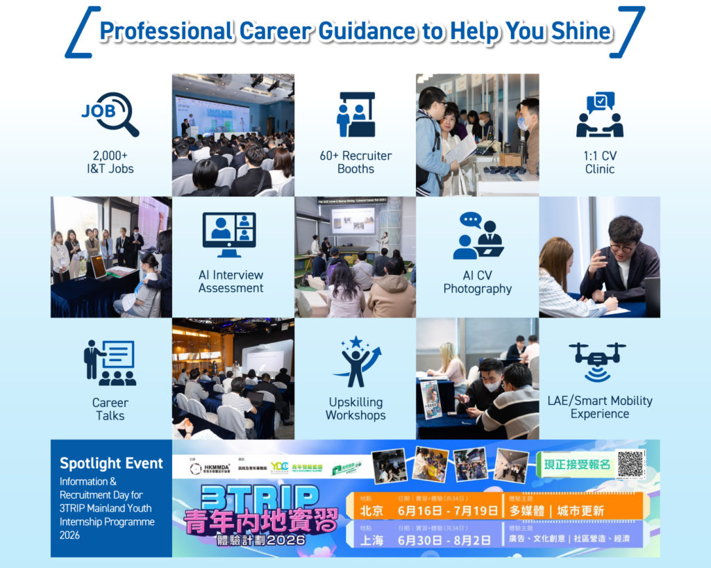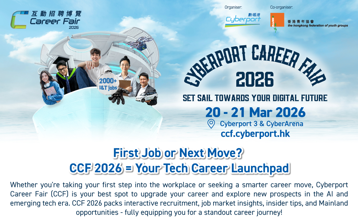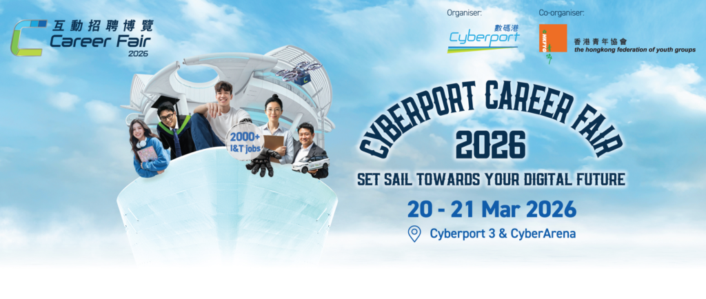 Cyberport Career Fair (CCF) 2026 is Hong Kong’s premier recruitment showcase, connecting Innovation & Technology (I&T) talent with leading employers. This year’s theme, “Set sail towards your digital future,” offers 2,000+ job openings and hands-on workshops — from AI interview training, CV clinic and insider tips from industry professionals — to help you stand out in a sea of sameness. Don’t miss this chance to discover the next chapter of your career!