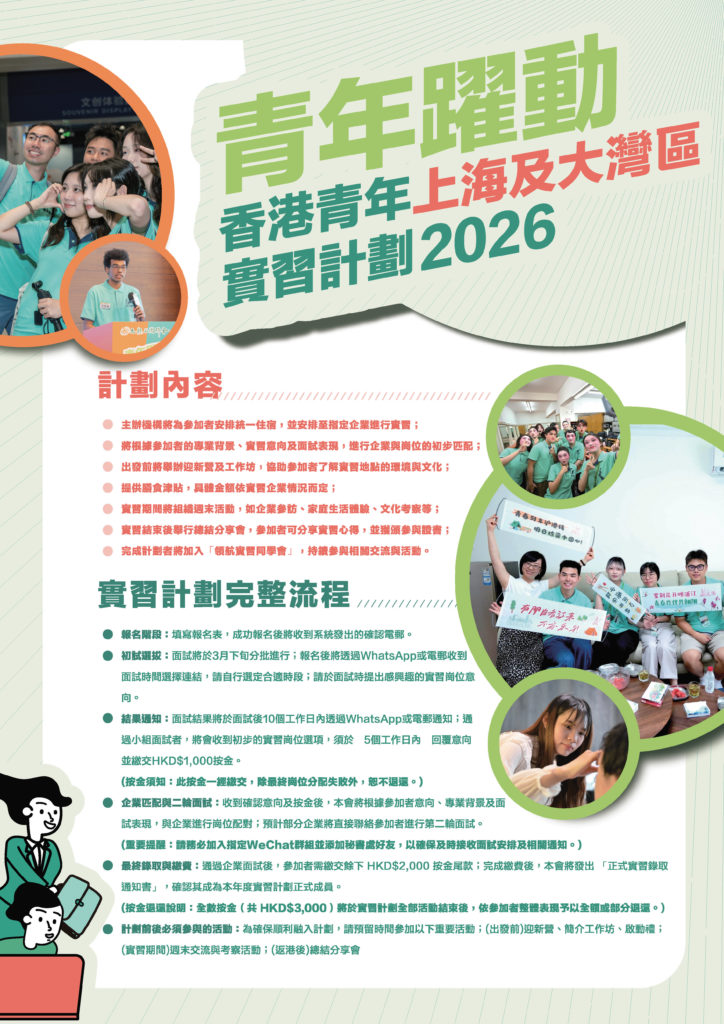 九龍社團聯會一直重視青年發展,積極推動青年參與實習、交流、創業、義工服務等範疇,期望青年能發揮所長。自2010年起每年均舉辦「青年躍動大學生實習領航計劃」,鼓勵青年人積極裝備自己,直至2025年合共將近3,400名學生參與,成功配對超過800個不同類型的職位,與100多間大企業及機構合作。今年,本會繼續獲得民政及青年事務局資助於2026年6月至8月期間舉辦「青年躍動.香港青年上海及大灣區(珠海)實習計劃2026」,帶領香港青年前往上海及珠海兩地進行實習,令香港青年親身體驗職場現況,從而裝備自己為未來就業作好準備。