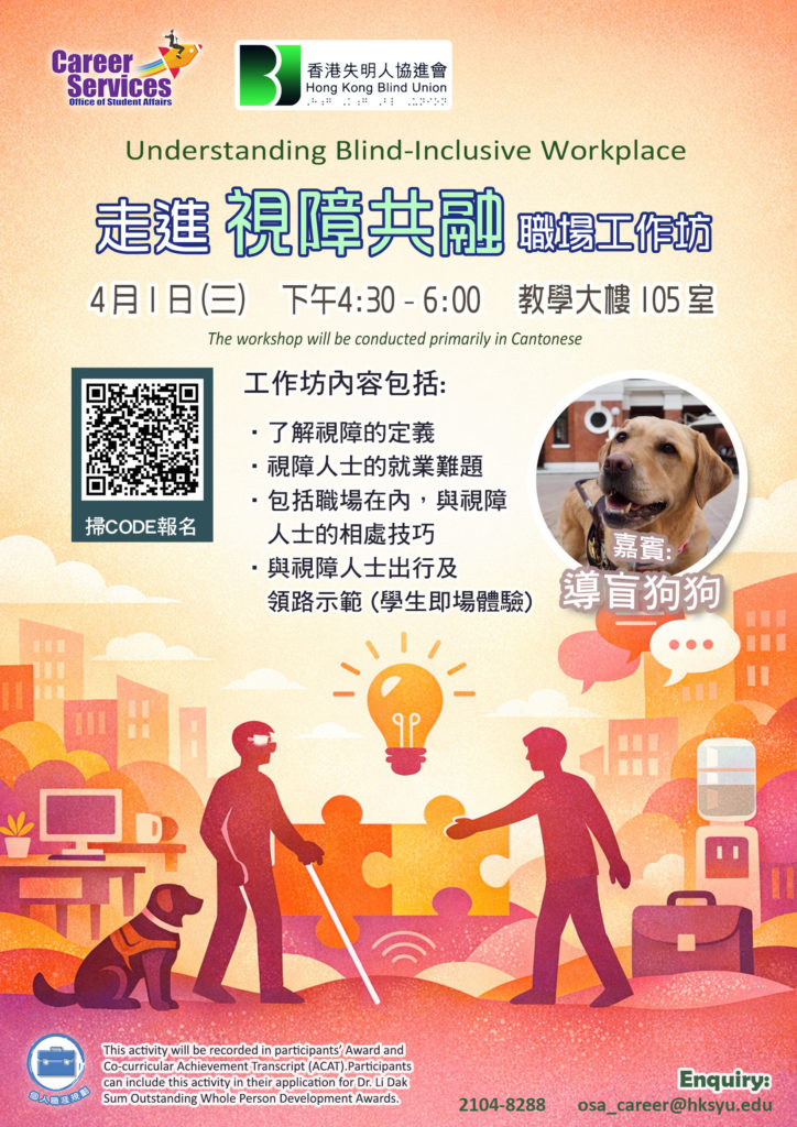 為了讓同學更了解視障人士在職場中的處境與需要,誠意邀請各位你參加 走進視障共融 – 職場工作坊。聚焦視障人士與健視人士在工作環境中的溝通、協作與融合,幫助大家從更多角度認識「共融職場」的重要性。