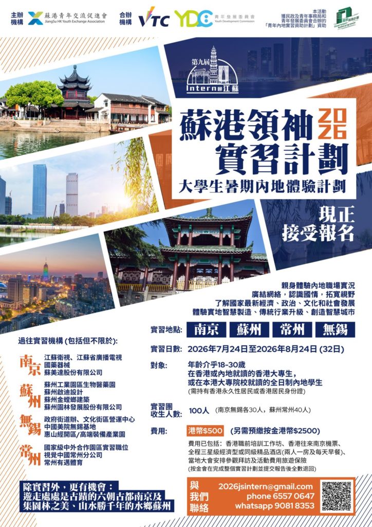 JiangSu HK Youth Exchange Association(蘇港青年交流促進會)is launching its 第九屆Intern@江蘇2026 蘇港領袖實習計劃, scheduled for this summer from 24 July 2026 to 24 August 2026 (32 days).  This internship program aims at strengthening the competitive edge of students in job market.  Students will gain working experience as interns to be placed in various renowned enterprises in Nanjing, Suzhou, Changzhou and Wuxi. The program fee is at HKD500 only, covering training prior to the trip, airfares, accommodation, company visits, tourism as well as travel insurance.  Students can explore social networks, envision the latest social, economic and cultural development on the Chinese mainland.