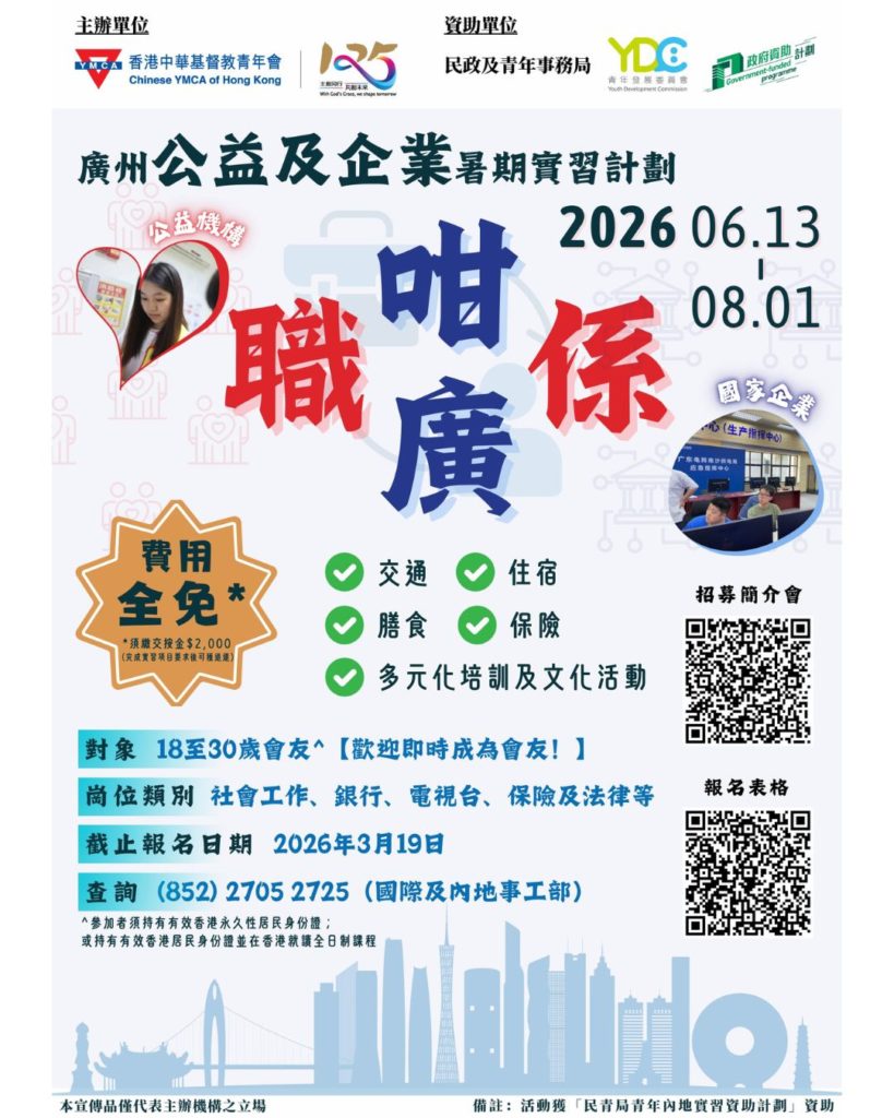 無論你是對公益服務充滿熱情,還是渴望在企業職場中一展身手,今個暑假有機會了!本會獲民政及青年事務局及青年發展委員會合辦的「民青局青年內地實習資助計劃」資助,招募18至30歲會友到廣州公益機構或企業進行實習,累積工作經驗和人脈。啟程前還有職涯規劃工作坊,幫助你探索自身職涯方向,為未來就業鋪路!