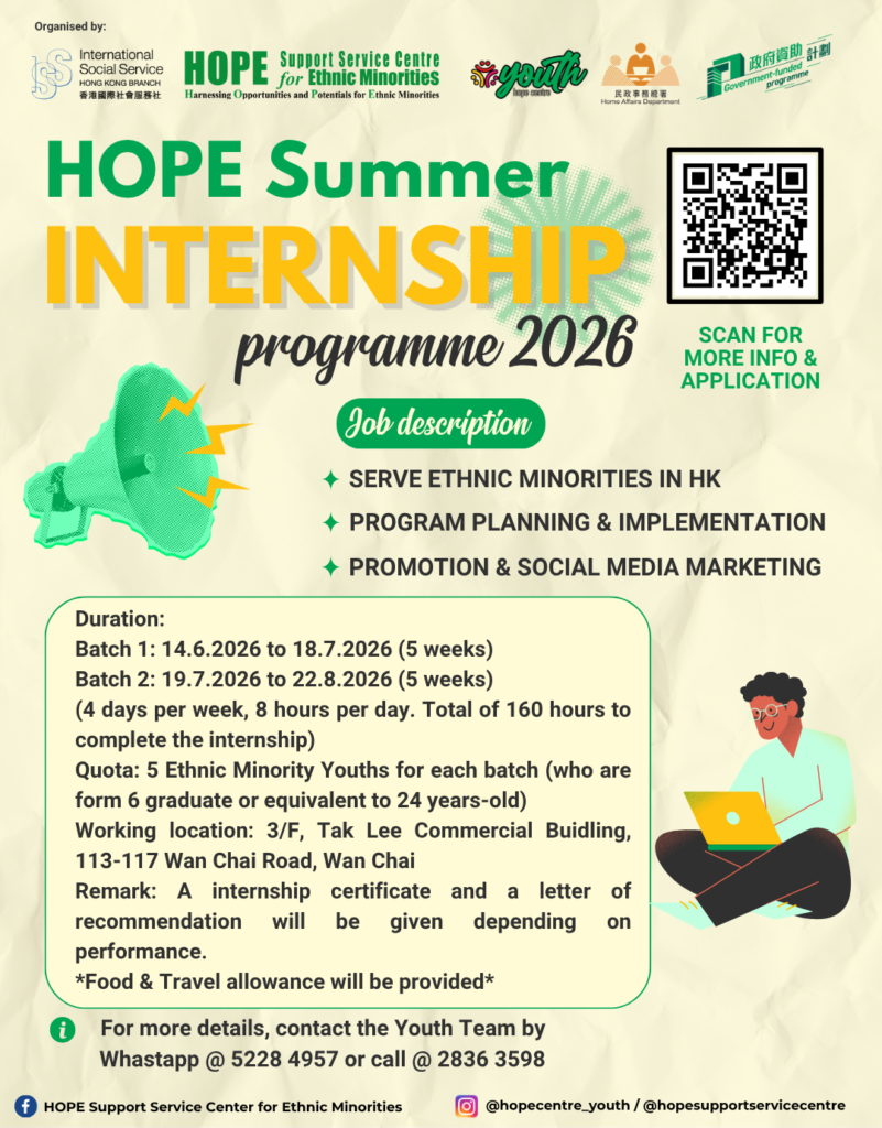 ISS-HK HOPE Support Service Centre for Ethnic Minorities is organising a summer Internship Programme for ethnic minority students