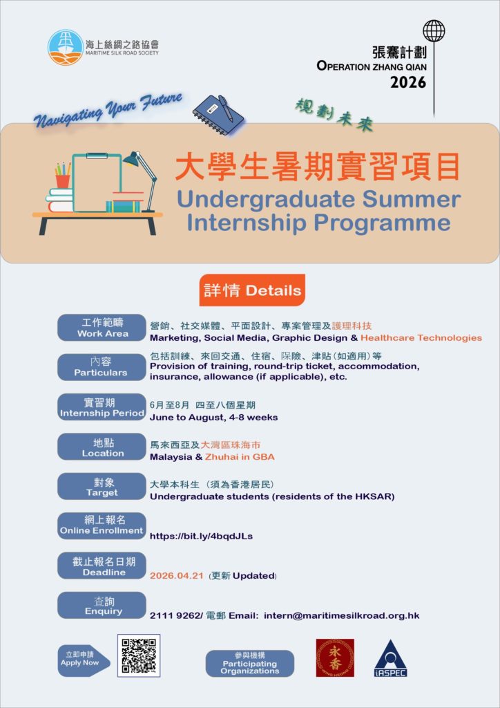 In addition to the internship positions in Malaysia, this year’s Operation Zhang Qian Programme now invites applications from full-time undergraduate students to apply for two additional posts to work in Zhuhai in the Greater Bay Area. iASPEC Services Limited offers two positions for students undertaking Business Administration, Healthcare Management, Information Technology, Biomedical Engineering or related subjects to join their team in providing services to the elderly in GBA.