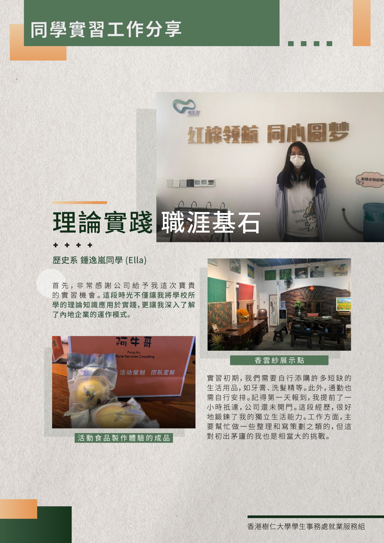 職場初探 實踐能力中文系 林鈺瑩 (Anna) 會通業理 港陸交流會計系 張恆源 (Mike) 惠州實習 築夢職場新傳系 彭希文 (Suzy) 策劃奇想 挑戰創新工管系 蔡知非 (Phoebe) 理論實踐 職涯基石歷史系 鍾逸嵐 (Ella) 陌生城市 開闊眼界英文系 鄧煒俞 (Grace) 學校支援 最佳後盾中文系 孫德懋 (Harold) 工管畢業 投身社福工管系 陳國浩 (Roy) 疫後復常 衝出香港英文系 丘素晶 (Cynthia)